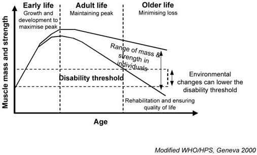 Krivulja na zgornjem graf prikazuje kako se mišična masa in mišična moč spreminjata skozi življenjsko obdobje. Navpični črtkani črti označujeta življenjska obdobja. Vodoravni črtkani črtici označujta območje, kjer zaradi prenizke mišične mase in preslabe mišične funkcije nismo več sposobni samostojnega življenja. Zgornja krivulja predstavlja telesno aktivnega posameznika. Spodnja krivulja pa posameznika, ki je že v obdobju odraščanja premalo časa namenil telesni aktivnosti, enak trend pa nadaljeval tudi v kasnejših življenjskih obdobjih. Zaradi prenizke mišične mase in posledično tudi preslabe mišične funkcije v starejšem obdobju svojega življenja, ne mora preživeti samostojno brez pomoči drugih, kar močno poslabša kvaliteto življenja v tem obdobju.